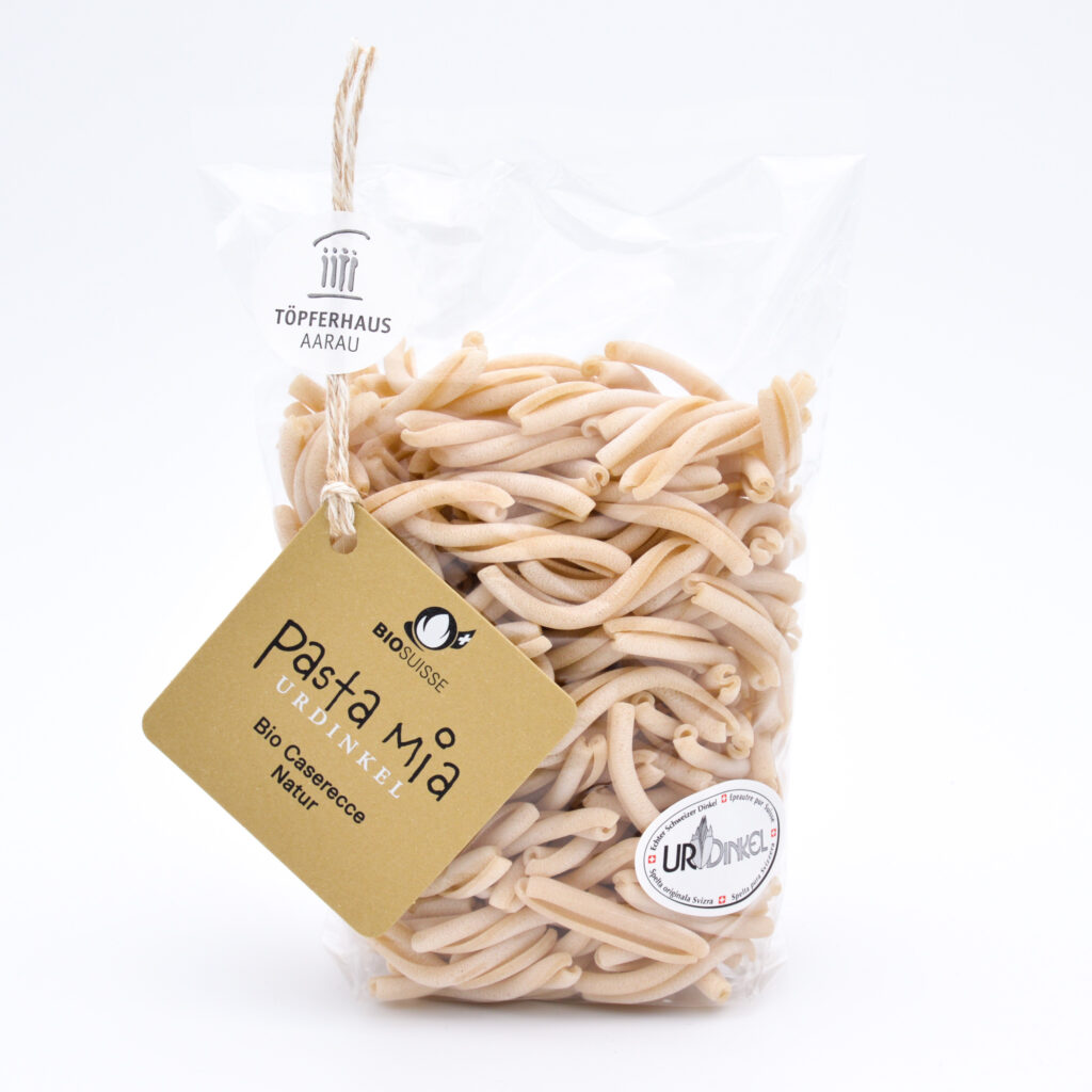 Wegen des Urdinkels ist diese Pasta die Urchige unter den mit der «Bio Gourmet Knospe» ausgezeichneten Teigwaren. 1996 hat die Interessengemeinschaft Dinkel (www.urdinkel.ch) die Marke UrDinkel ins Leben gerufen, die nur alte, nicht mit Weizen gekreuzte Sorten zulässt. Mit der Pasta Mia Urdinkel «Casarecce Natur» kommt also Natur pur auf den Teller.